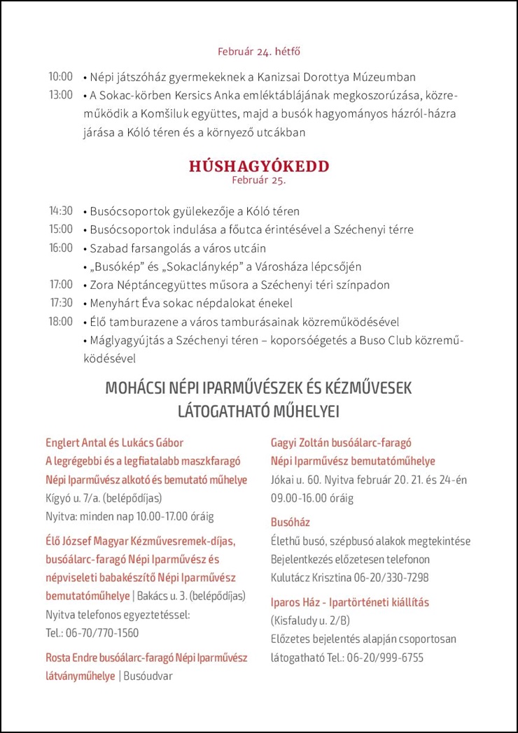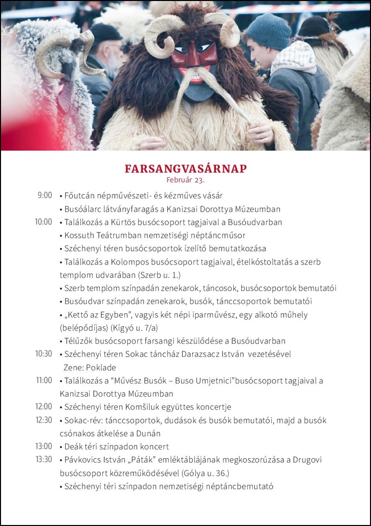 14.00 A Busójárás nyitórendezvénye – Közreműködik a Mohács Térségi Általános Iskola Széchenyi Iskolája, a Mohács Térségi Óvodaközpont Rókus és Eötvös Óvodája. A rendezvényt megnyitja Pávkovics Gábor Mohács Város Polgármestere
