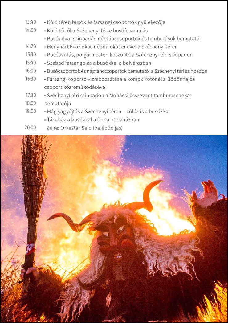 14.00 A Busójárás nyitórendezvénye – Közreműködik a Mohács Térségi Általános Iskola Széchenyi Iskolája, a Mohács Térségi Óvodaközpont Rókus és Eötvös Óvodája. A rendezvényt megnyitja Pávkovics Gábor Mohács Város Polgármestere